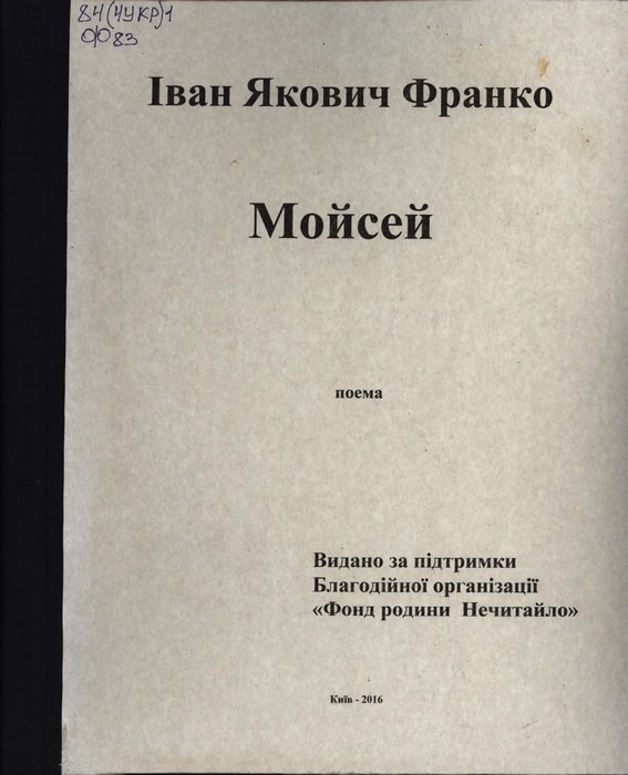 Мойсей : поема / І. Я. Франко; Фонд родини Нечитайло, Респуб. буд. звукозапису і друку УТОСу. – Київ : [б. в.], 2016. – 41 с.