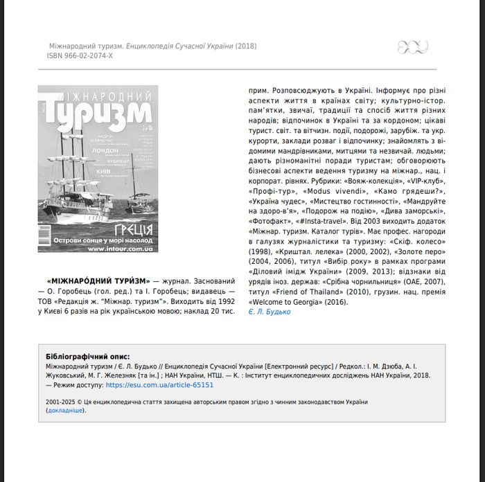 Користувачі можуть ознайомитись з енциклопедичною статтею про журнал «Міжнародний туризм» в Енциклопедії сучасної України: https://esu.com.ua/article-65151